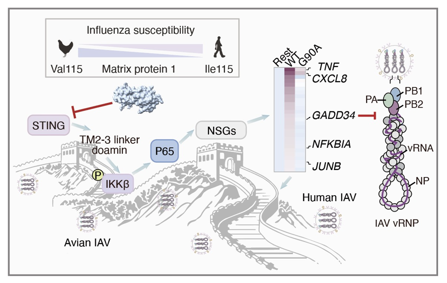 “STING G90与NF-κB信号通路的关键调节因子结合,成为连接cGAS-STING和NF-κB两条通路之间的‘桥梁’。”于晓方说,团队也在人体呼吸道原代细胞及点突变动物模型中进一步验证了STING-NF-κB对于禽流感的限制作用。