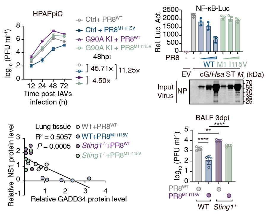 后续研究揭示了流感病毒应对人体免疫屏障的进化策略:M1蛋白第115位氨基酸是由缬氨酸(Val)向异亮氨酸(Ile)进化突变,这一突变显著增强了病毒对人源cGAS-STING通路,尤其是STING G90A的拮抗能力,从而提高其在人体细胞中的复制适应性。
